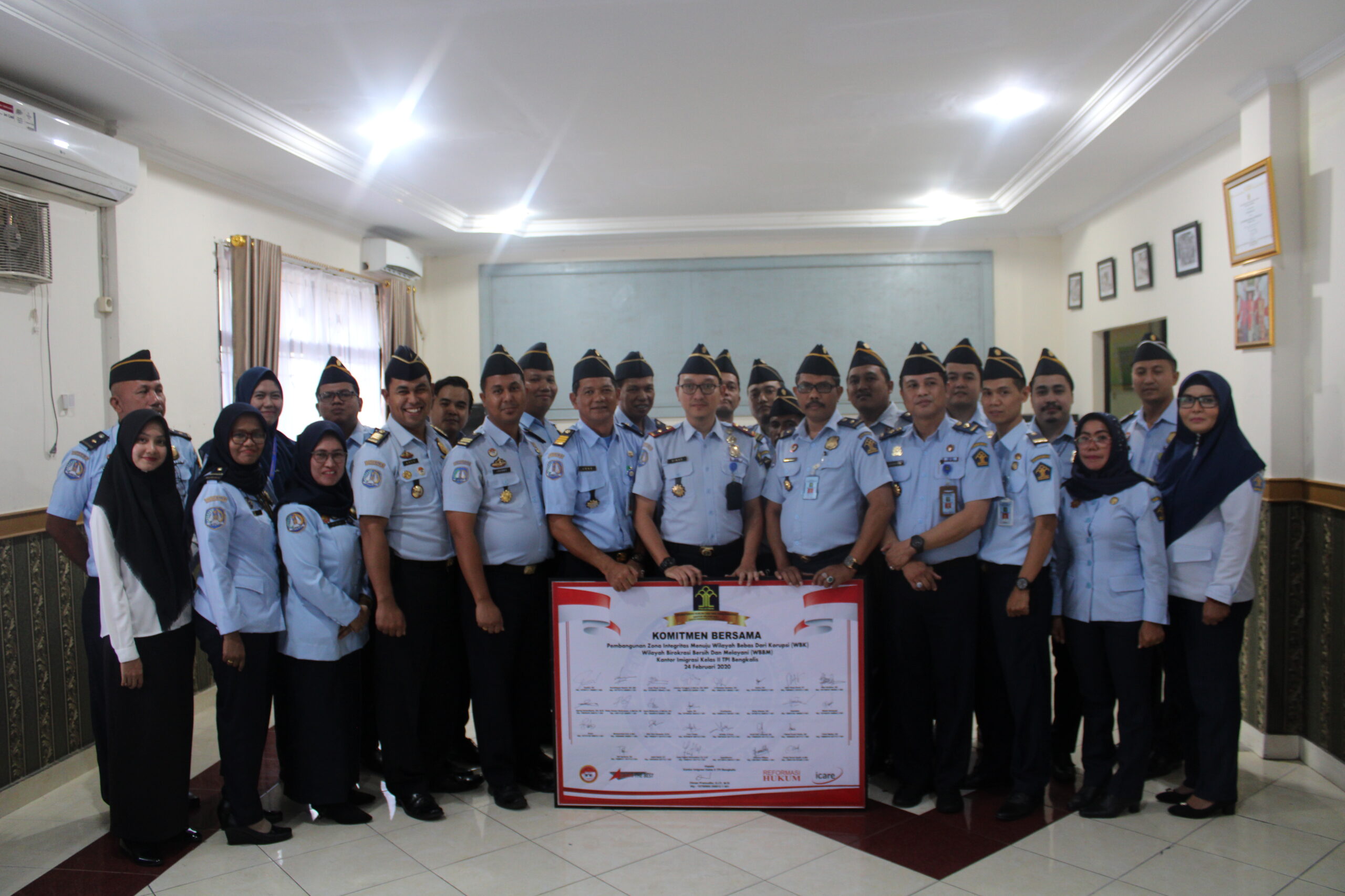 BENGKALIS – Senin (24/2/2020) di Aula Kantor Imigrasi, Kepala Kantor Imigrasi Bengkalis Dimas Pramudito pimpin kegiatan Penandatanganan Komitmen Bersama antara Kepala Kantor Imigrasi, Pejabat Struktural dan seluruh Pegawai.