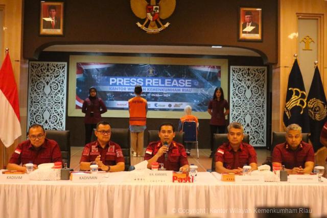 Informasi ini disampaikan langsung oleh Kepala Kantor Wilayah Kemenkumham Riau, Budi Argap Situngkir, yang turut didampingi Kepala Divisi Administrasi Johan Manurung, Kepala Divisi Keimigrasian Mas Arie Yuliansa Dwi Putra, Kepala Kantor Imigrasi Kelas I TPI Dumai Ricky Rachmawan dan Penanggung Jawab Pengawasan Keimigrasian Wilayah I Direktorat Jenderal Imigrasi, Prihatno Juniardi dalam konferensi pers yang digelar pada Kamis (17/10/2024) bertempat di ruang serbaguna Ismail Saleh.